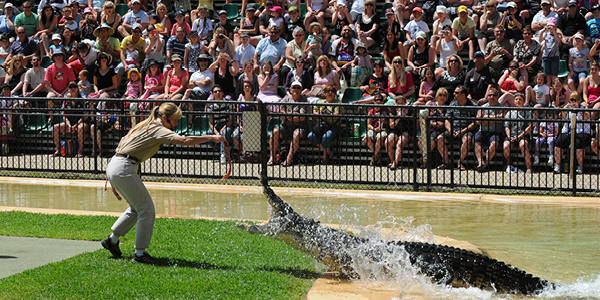 Terri Irwin feeding a crocodile during an experience.